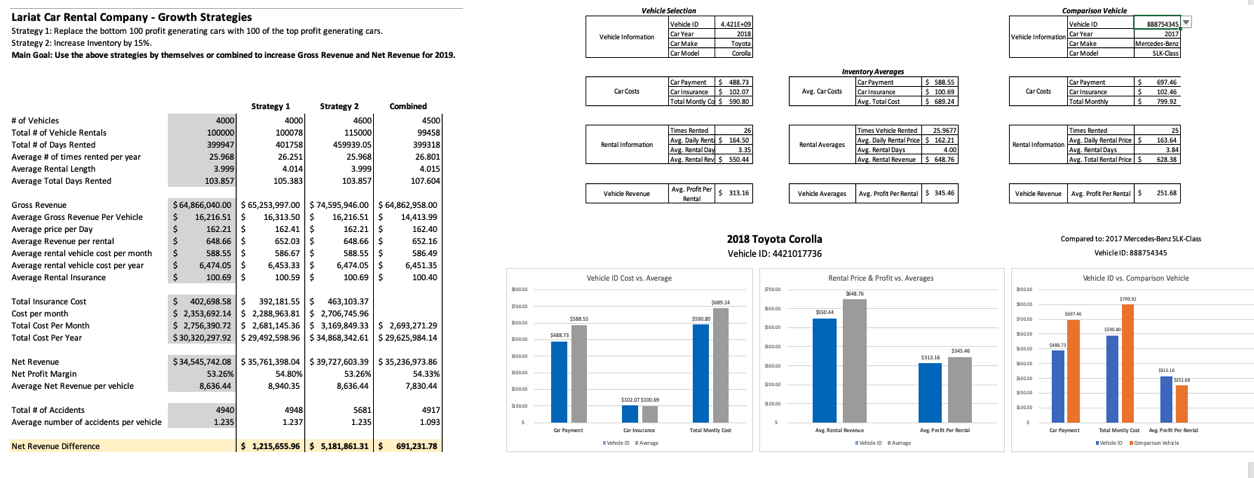 This project details data modeling in Excel followed with a mock slideshow presentation for the fictional company Lariat Car Rental. Here I analyzed and compiled raw data, created a functional user-friendly modeling page, and translated those models into visualization. The purpose of this project was to create models in an effort to boost Gross Revenue & Net Revenue in achievable ways.